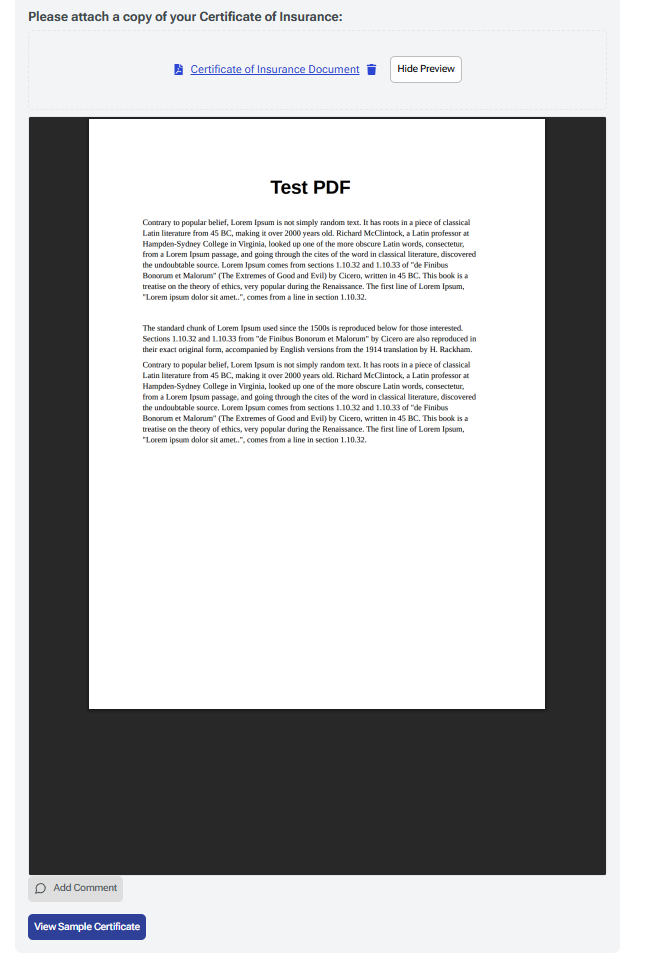 - Inline PDF Viewing - Reviewers and Approvers may now view the uploaded pdf documents as inline documents within the Enrollment form. Bank documents, wire transfer documents, certificates of insurance and certificates of clearance (WCB) can now each be viewed without the need to first download the document.