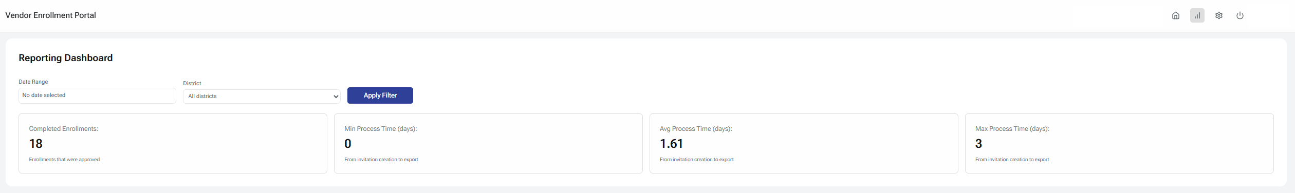 - Reporting Dashboard– A dashboard provided to administrators of the system which will present several key metrics which will include the following: